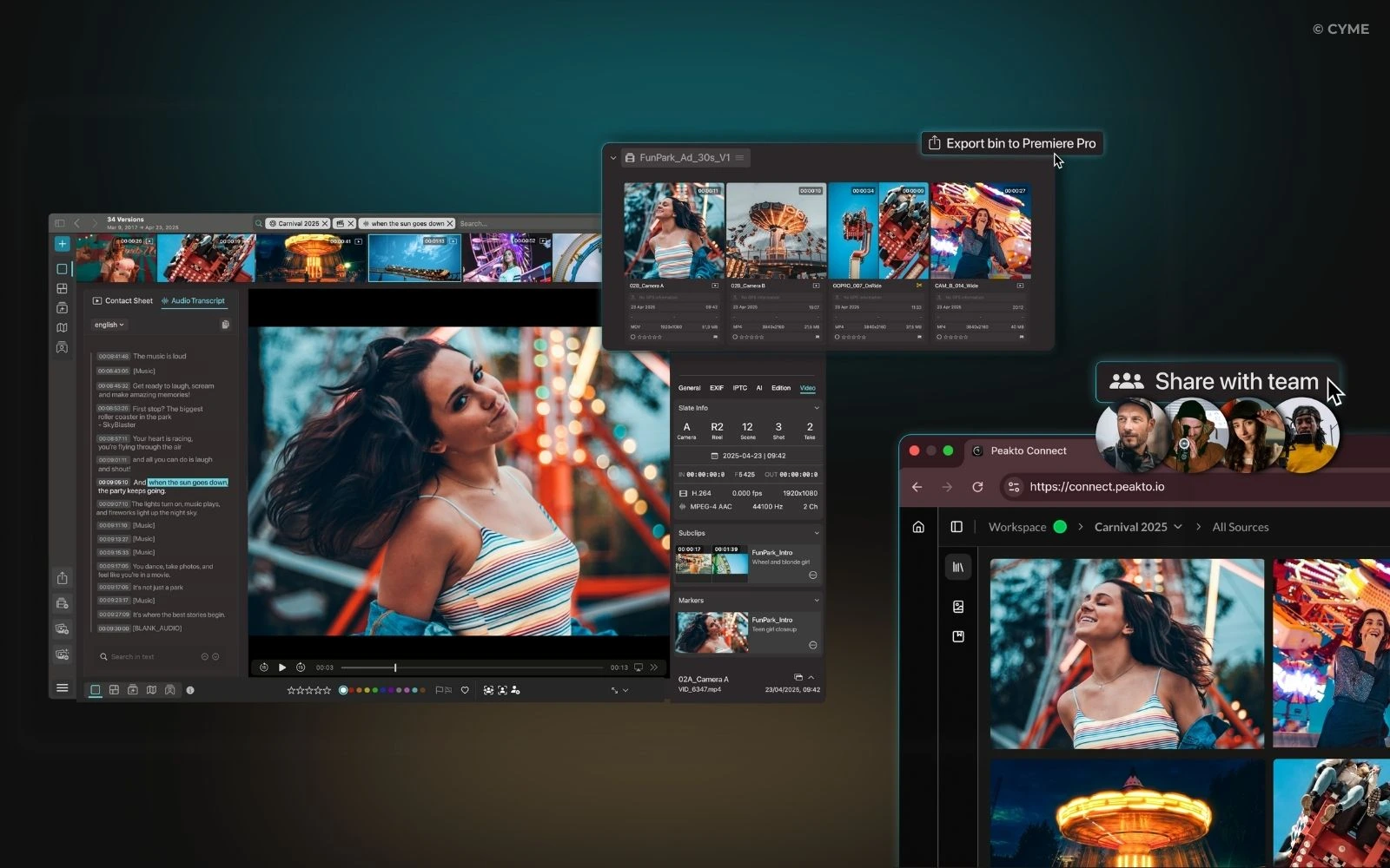 With features designed specifically for video professionals—scene- or dialogue-based search, bin creation to speed up footage review, and seamless workflows to Premiere Pro and Final Cut Pro—Peakto established itself as a natural companion for organizing and selecting footage. Studios, schools, and creative teams quickly adopted these tools, making Peakto a new reference for anyone working with moving images.