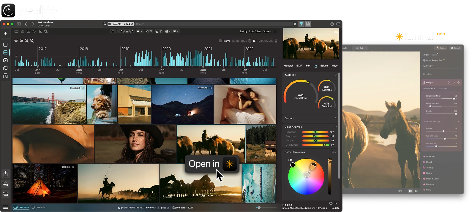 編集は旅の一部に過ぎません。Peaktoは、複数のディスクやカタログに分散した写真でも簡単に整理・検索できるようにすることで、Luminar Neoを補完します。LuminarとPeaktoを組み合わせることで、写真の整理から最終的な編集まで、あなたの写真制作を完全にコントロールできます。